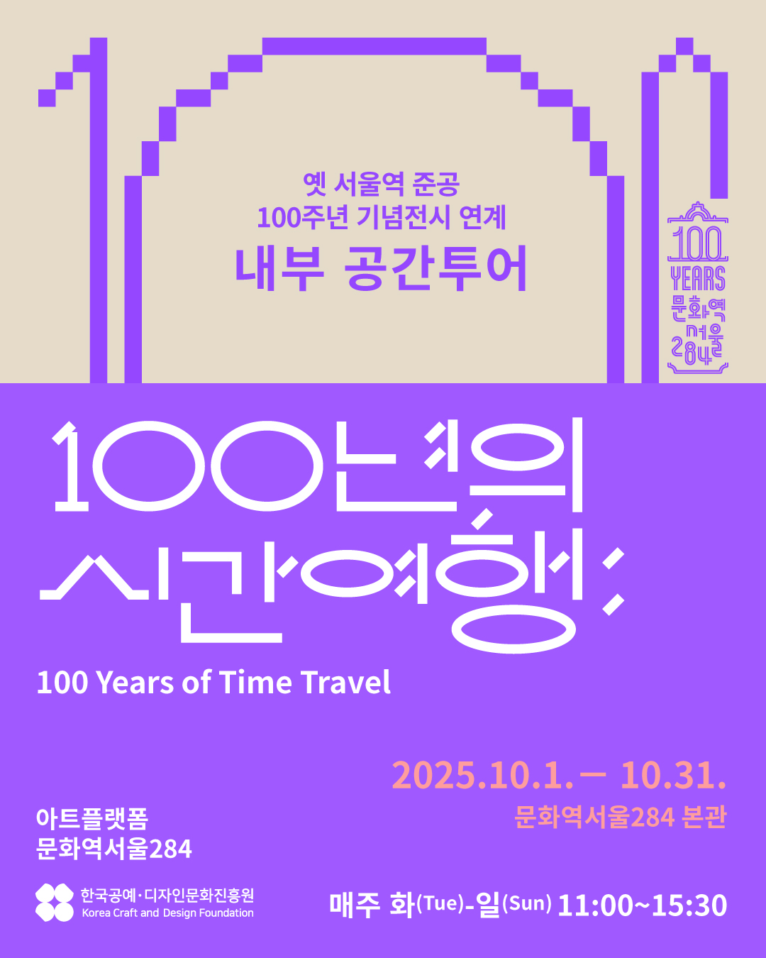 문화역서울284 내부 공간투어(10.1 ~ 10.31) 문화역서울284 아트플랫폼 <100년의 시간여행> 내부 공간투어 *전시와 연계된 공간 역사 해설 프로그램입니다. *실제 참여 인원 수에 맞춰 온라인 예약 바랍니다. 신청2025-09-12 ~ 2025-10-31 운영2025-10-01 ~ 2025-10-31 매주 화~일, 11:00/12:30/14:00/15:30