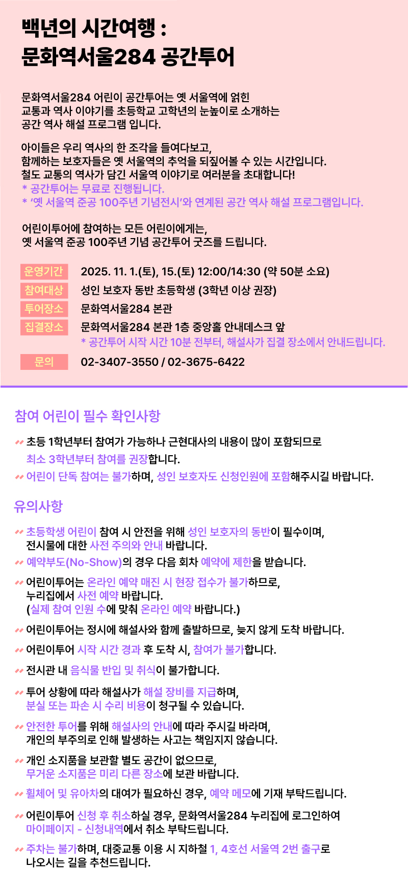 * 어린이투어 신청 후 취소하실 경우, 문화역서울284 누리집에 로그인하여 마이페이지 - 신청내역에서 취소 부탁드립니다.