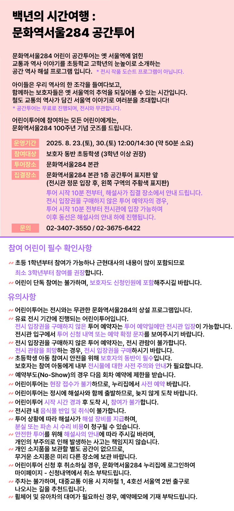 * 어린이투어 신청 후 취소하실 경우, 문화역서울284 누리집에 로그인하여 마이페이지 - 신청내역에서 취소 부탁드립니다.