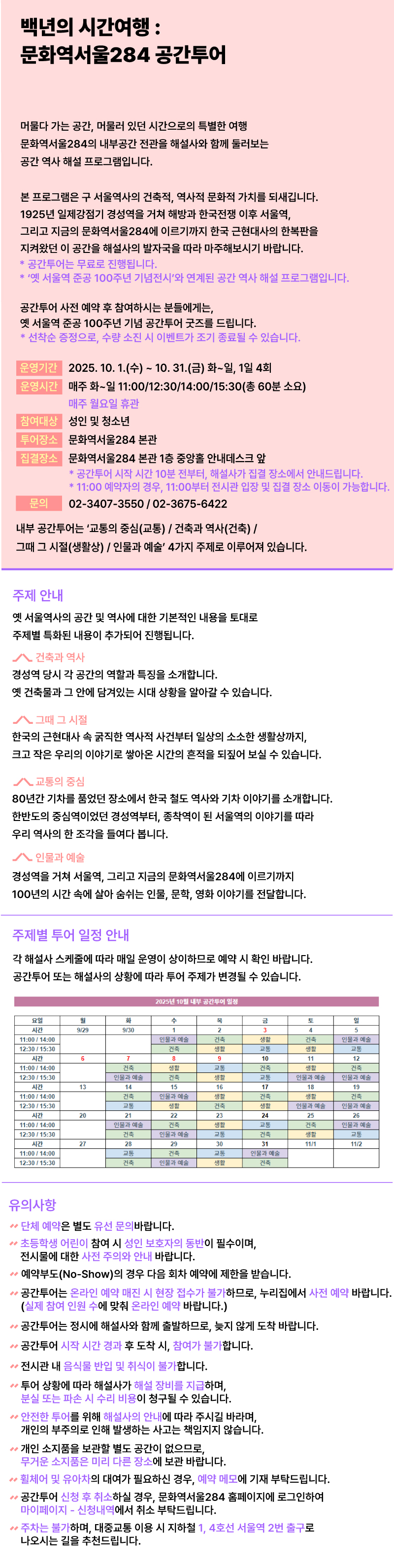 * 공간투어 신청 후 취소하실 경우, 문화역서울284 홈페이지에 로그인하여 마이페이지 - 신청내역에서 취소 부탁드립니다.