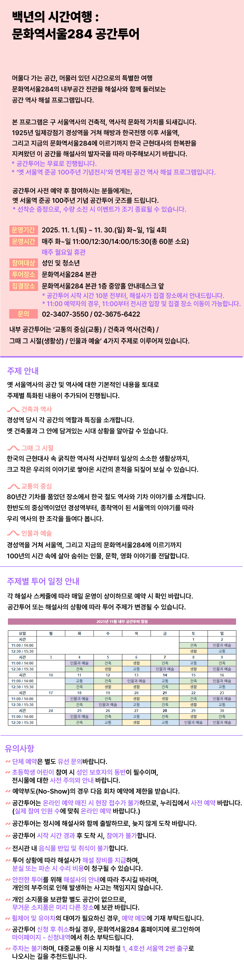 * 공간투어 신청 후 취소하실 경우, 문화역서울284 홈페이지에 로그인하여 마이페이지 - 신청내역에서 취소 부탁드립니다.
